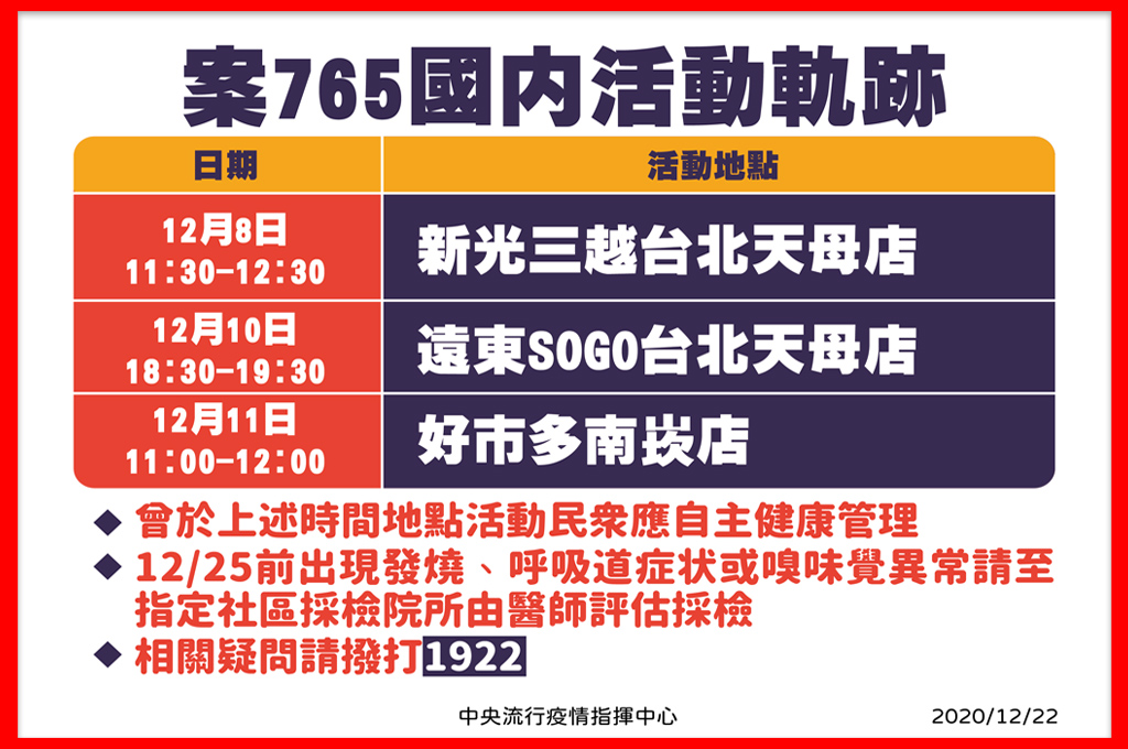 為釐清案765(外籍機師)於12月8日至12日間之活動史與接觸者,經衛生、警政單位密切調查個案活動軌跡發現,個案於上述期間曾有多處公共場所活動史,包括新光三越天母店、遠東SOGO天母店、好事多南崁店。陳時中提醒曾於所列時段出入相關場所的民眾,請自主健康管理,12月25日前如出現相關症狀,應戴上口罩前往全國指定社區採檢院所,經醫師評估是否採檢。